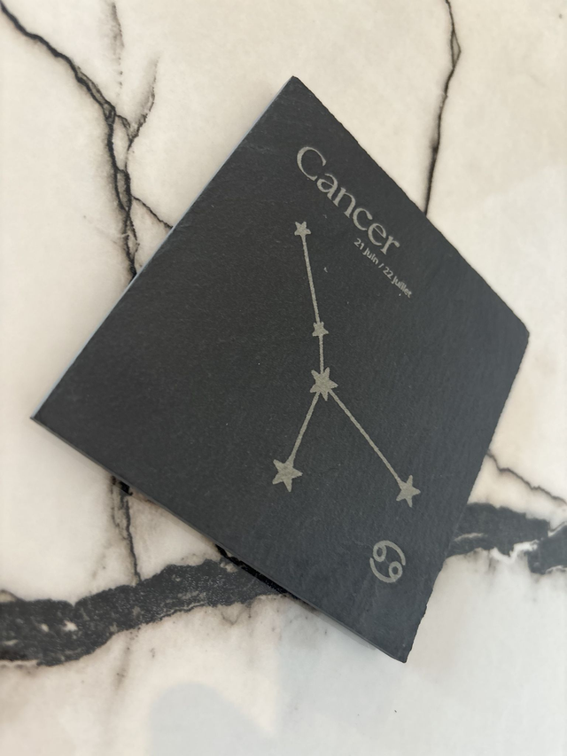 Découvrez notre collection de dessous de verre en ardoise gravée, dédiée aux 12 constellations du zodiaque, chacune proposée séparément pour correspondre parfaitement à votre signe astrologique. Chaque pièce est soigneusement gravée pour révéler la constellation associée à son signe, accompagnée de son nom, pour un rendu à la fois raffiné, intemporel et chargé de sens.